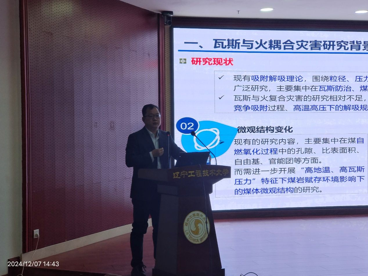报告中,田研究员首先向师生们详细介绍了瓦斯气体对煤自然氧化的微观作用机制,阐释了采空区遗煤中吸附瓦斯对煤自燃的内在影响特征。接着,从吸附态瓦斯影响下的煤自燃特性、采空区含瓦斯煤自燃多场耦合特征以及采空区含瓦斯煤自燃监测预警理论应用3个方面,深入阐述了国内外最新进展。最后,田研究员提出了采空区遗煤在吸附态瓦斯影响下的自燃过程特性、含瓦斯煤自燃流-固-热-化多场耦合特征、含瓦斯煤自燃监测预警理论应用等亟待突破的瓶颈问题,和在座师生展开了深入的交流。
